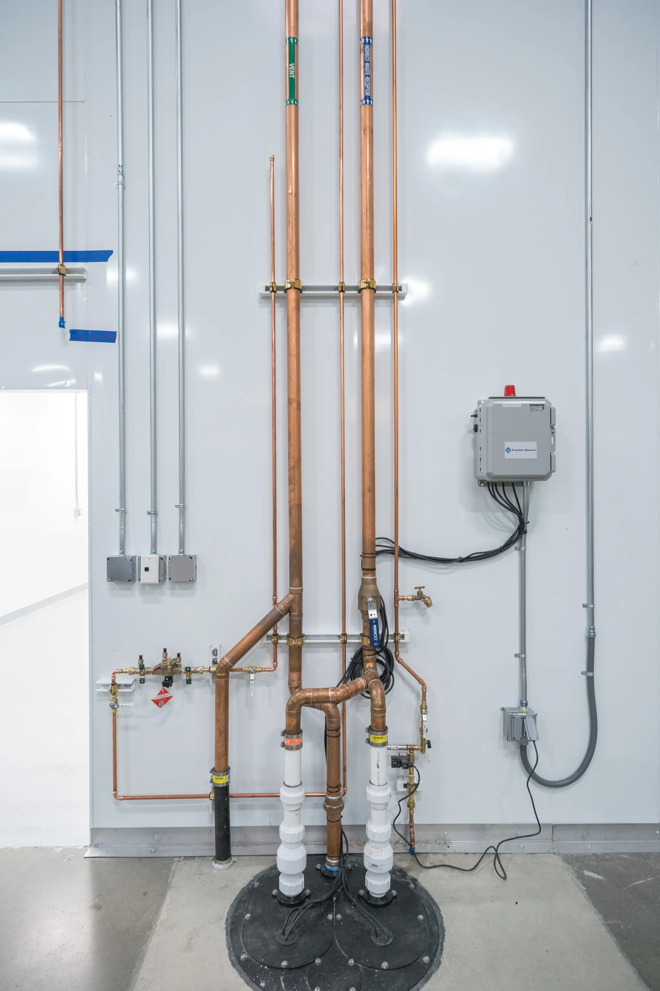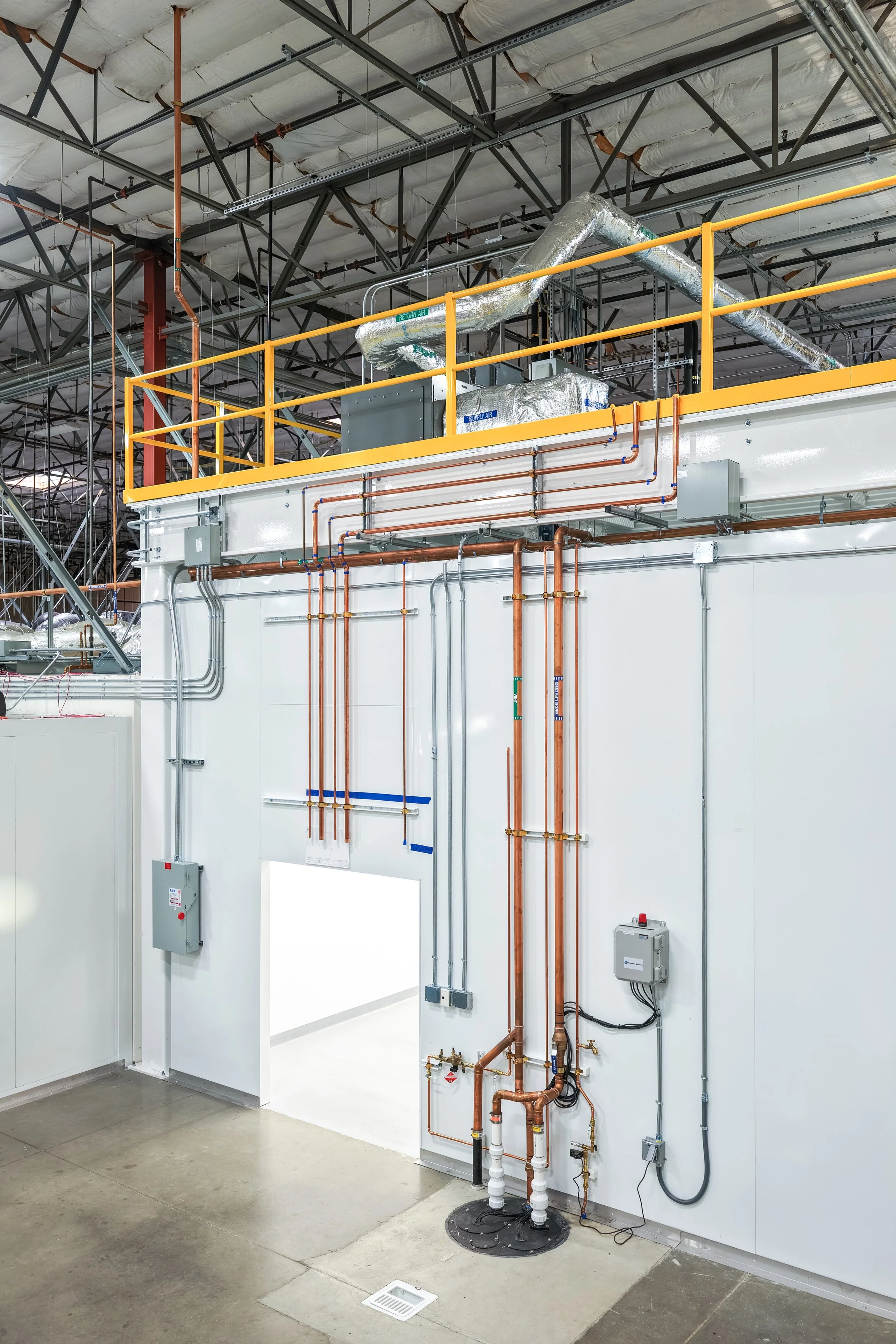 For production needs, new LN2 and CDA systems were added along with all associated process piping to service (2) 200L lyophilizers and (4) 50L lyophilizers. Finally, a structural steel mezzanine was constructed above the clean room to accommodate the additional M/E/P equipment required for the facility